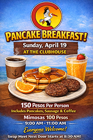 Join us at the Clubhouse on Sunday, April 19 from 9:00 AM to 11:00 AM for a relaxed and delicious morning with friends and neighbors. For just 150 pesos per person, enjoy a hearty breakfast of fluffy pancakes, sausage patties, and fresh coffee. It’s the perfect way to start your Sunday — whether you’re fueling up for the day or just looking to linger over good conversation.